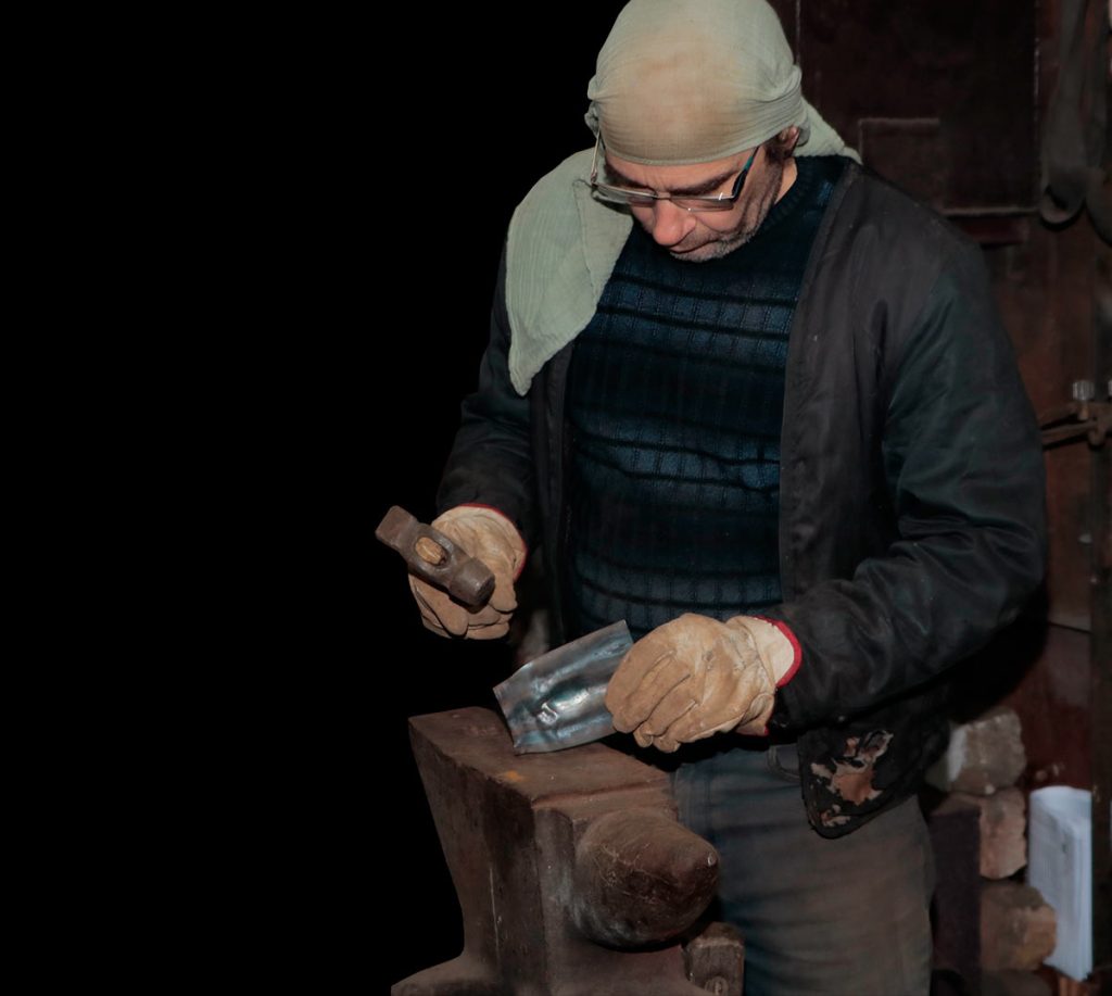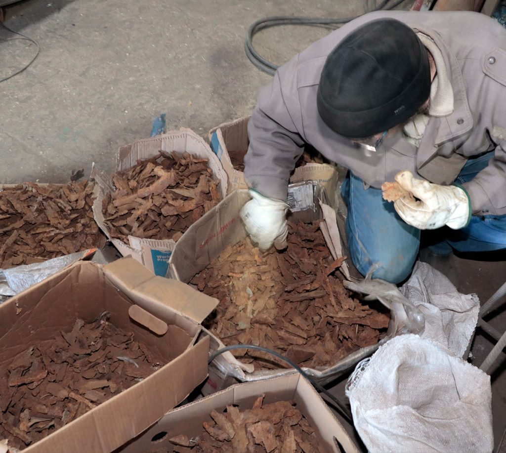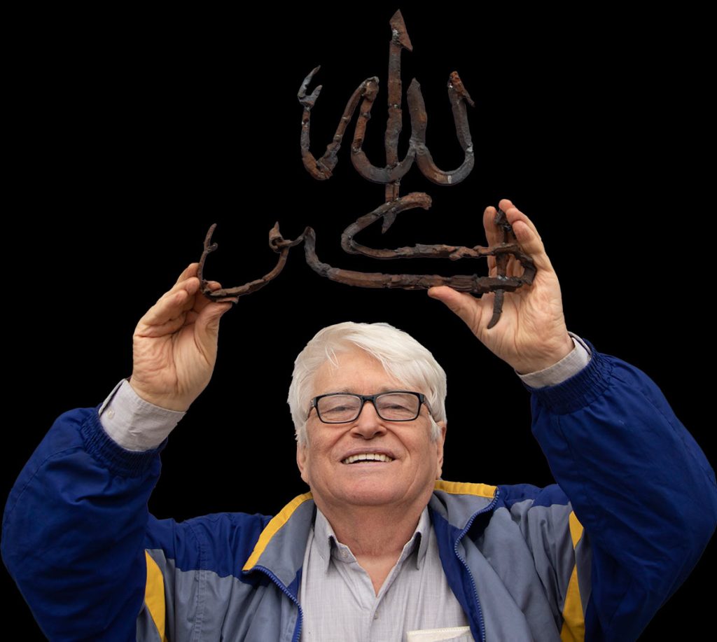 Viktor Bielchyk examining shrapnel fragments collected from the front lines.