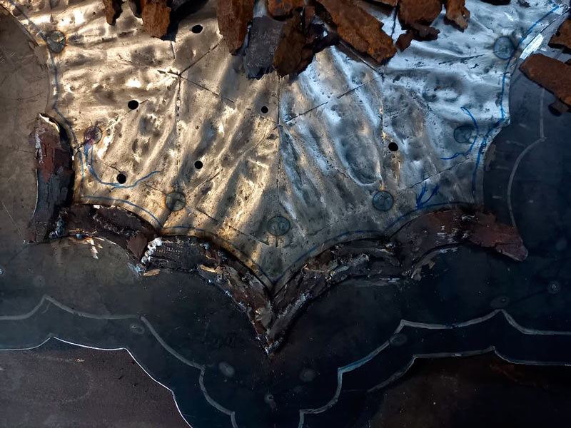 The Art of MFF | Both frames are constructed through the careful selection of curved artillery shell fragments, chosen for their appropriate form. The fragments forming the lowest layer are joined by electric welding and subsequently mechanically smoothed, ensuring that the resulting base of the frame sits flush against the principal plane of the sculptural composition.