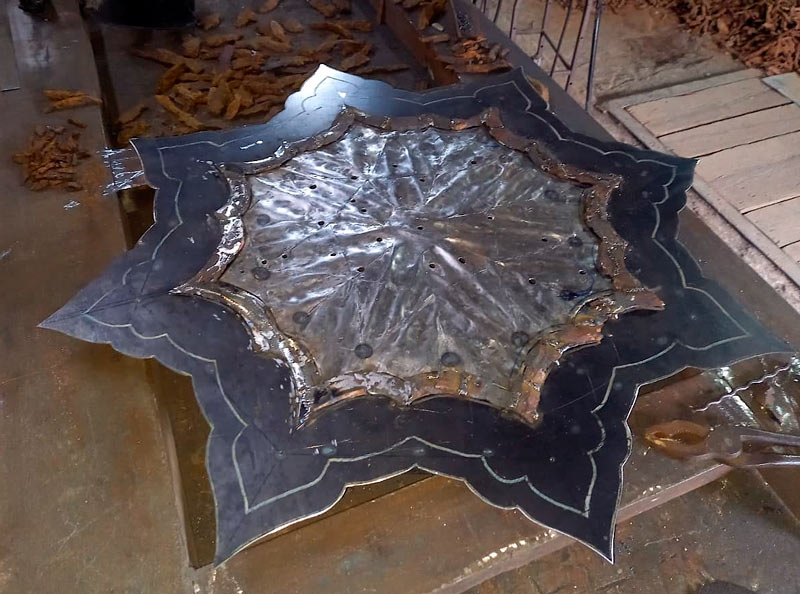 This section of the sculpture will be finished through electroplating layers of nickel, copper, and chromium, producing a green tonality traditionally associated with Islamic visual culture.
