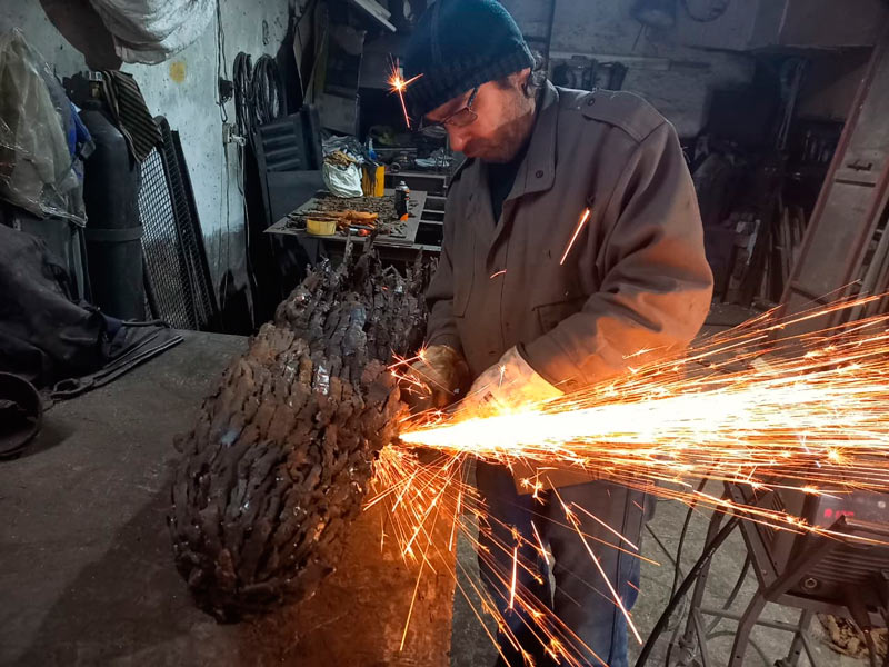 The sculpture The Silent Uprising of an Angel is being crafted using a one-of-a-kind technique developed by MFF. The material for this winged figure consists of fragments of artillery shells and mines collected from active war zones in Ukraine.