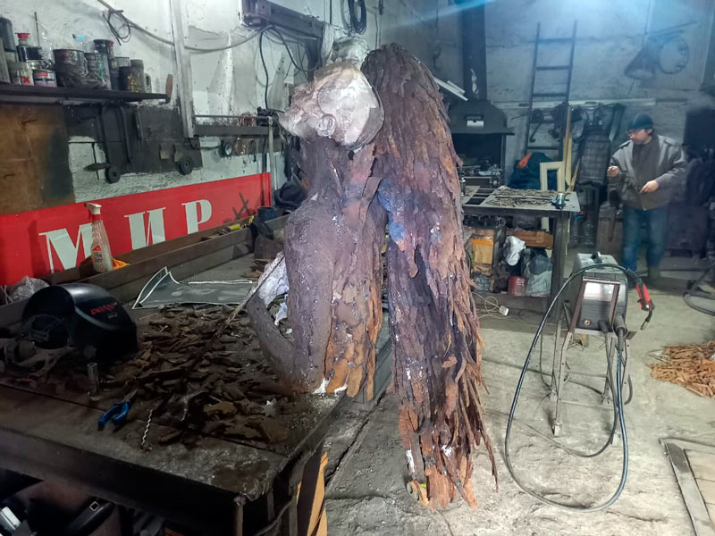The winged figure, two meters tall and weighing over half a ton, is being created from real fragments of artillery shells and mines collected in active combat zones in southern Ukraine during 2024–2025. Each piece retains its original, explosion-torn shape; the artist does not alter the geometry but instead assembles them into a unified body — as if piecing together a monumental puzzle in which the metal of war becomes the flesh of the Angel.